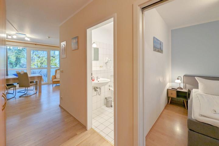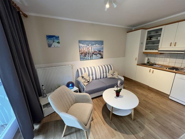Der gemütliche Wohn- und Essbereich mit Zugang zum Balkon bietet neben einem Esstisch für 4 Personen eine Schlaf-Couch für 2 weitere Schlafplätze sowie eine komplett-ausgestattete Küchenzeile mit Mikrowelle, Geschirrspüler, Kaffeemaschine & Wasserkocher.