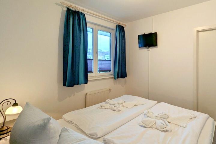Das Schlafzimmer ist mit einem Boxspringbett für 2 Personen, einem großzügigen Kleiderschrank und TV ausgestattet. Im Badezimmer mit Dusche finden Sie weitere Utensilien wie Waschtisch, Schmink-Spiegel und Haartrockner.